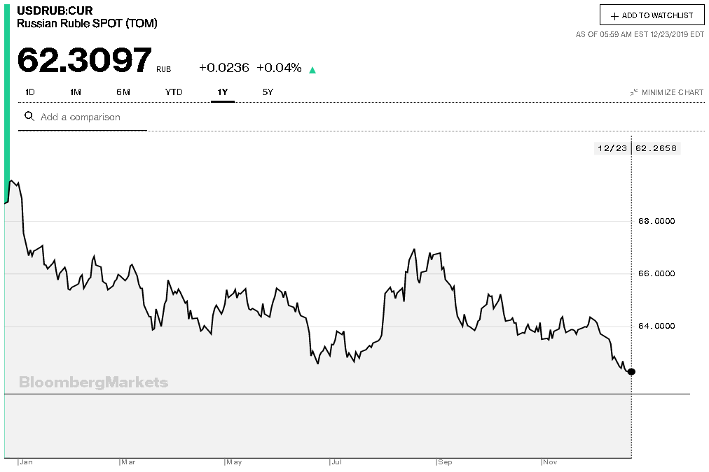 ووفقا لبيانات الوكالة فقد نمت العملة الروسية مقابل الدولار خلال 2019 بأكثر من 10%، وفيما يلي رسم بياني يظهر حركة الروبل خلال الأشهر الـ12 الماضية.